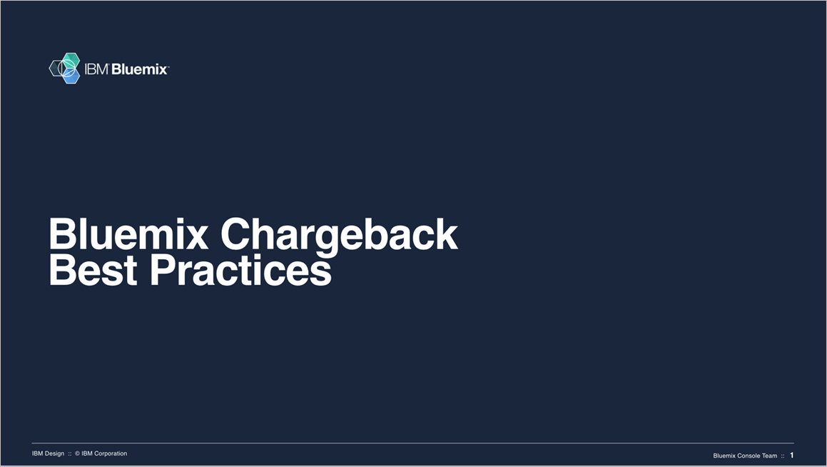 I worked with a product manager and the administrator of IBM's internal Bluemix Cloud to develop the Bluemix Chargeback Best Practices. We developed multiple options and shared this with many of our largest customers. They also contributed their ideas with us which we included in future iterations of our best practices. While the presentation was a bit dry, customers deeply appreciated the work it saved them.