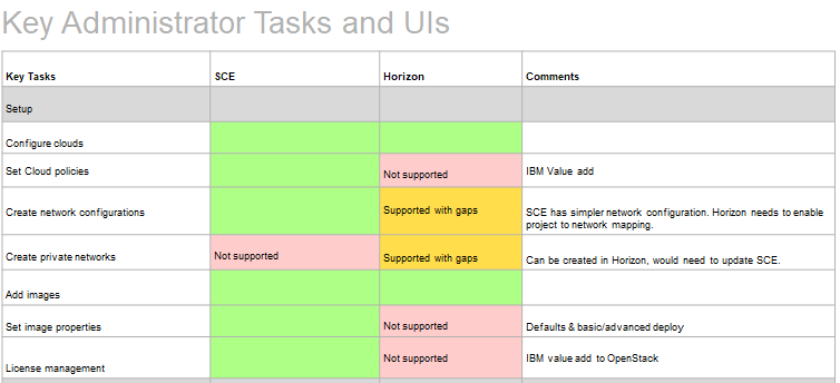 To understand the requirements, I created a comprehensive gap analysis, comparing the existing SmartCloud Entry to OpenStack Horizon. The analysis included functionality, and a terminology mapping. There were 6 pages of tables covering every aspect of the product.