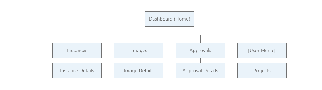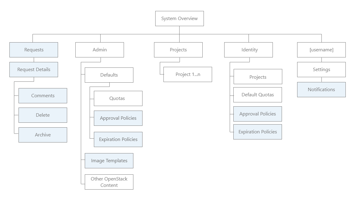Next, I created an IA for each of the portals. The Self-Service Portal was very similar to the original SmartCloud Entry one. Because the admin portal was extending OpenStack Horizon, I needed to blend our extensions into the existing UI (IBM additions are shown in blue below).