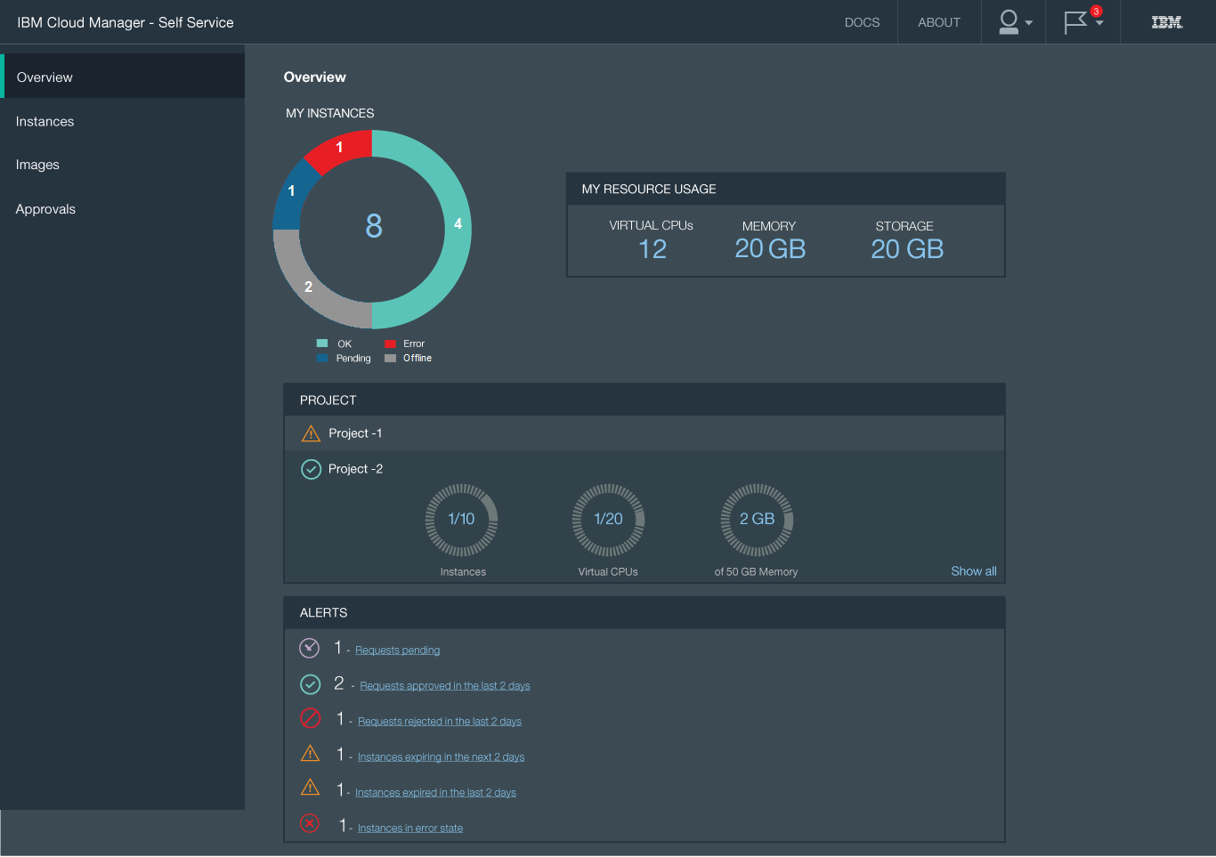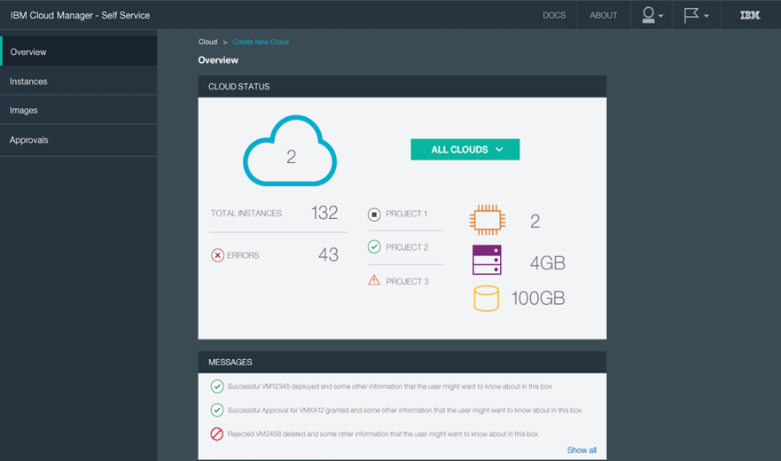 The 4.3 release of IBM Cloud Manager with OpenStack (formerly SmartCloud Entry) introduced a major UI change, splitting the UI into two new consoles: an Admin Portal and a Self-Service Portal. In this project, the challenge was to preserve the simplicity and the user experience of the original product.