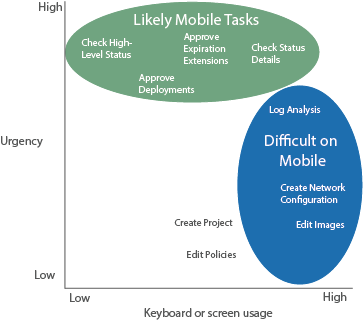 Customer research found that mobile management UIs were good for tasks that were simple but high-impact: alerting, status checks and approvals. Other tasks did not lend themselves to mobile, for example, customers said they would go to their laptop for anything involving significant typing or scrolling. Other tasks required planning and approvals and likely wouldn't be done while they were on the run. The phone app gave them a way to quickly resolve some tasks and to know which ones required their laptop. It also helped them to get back to their lives quickly.