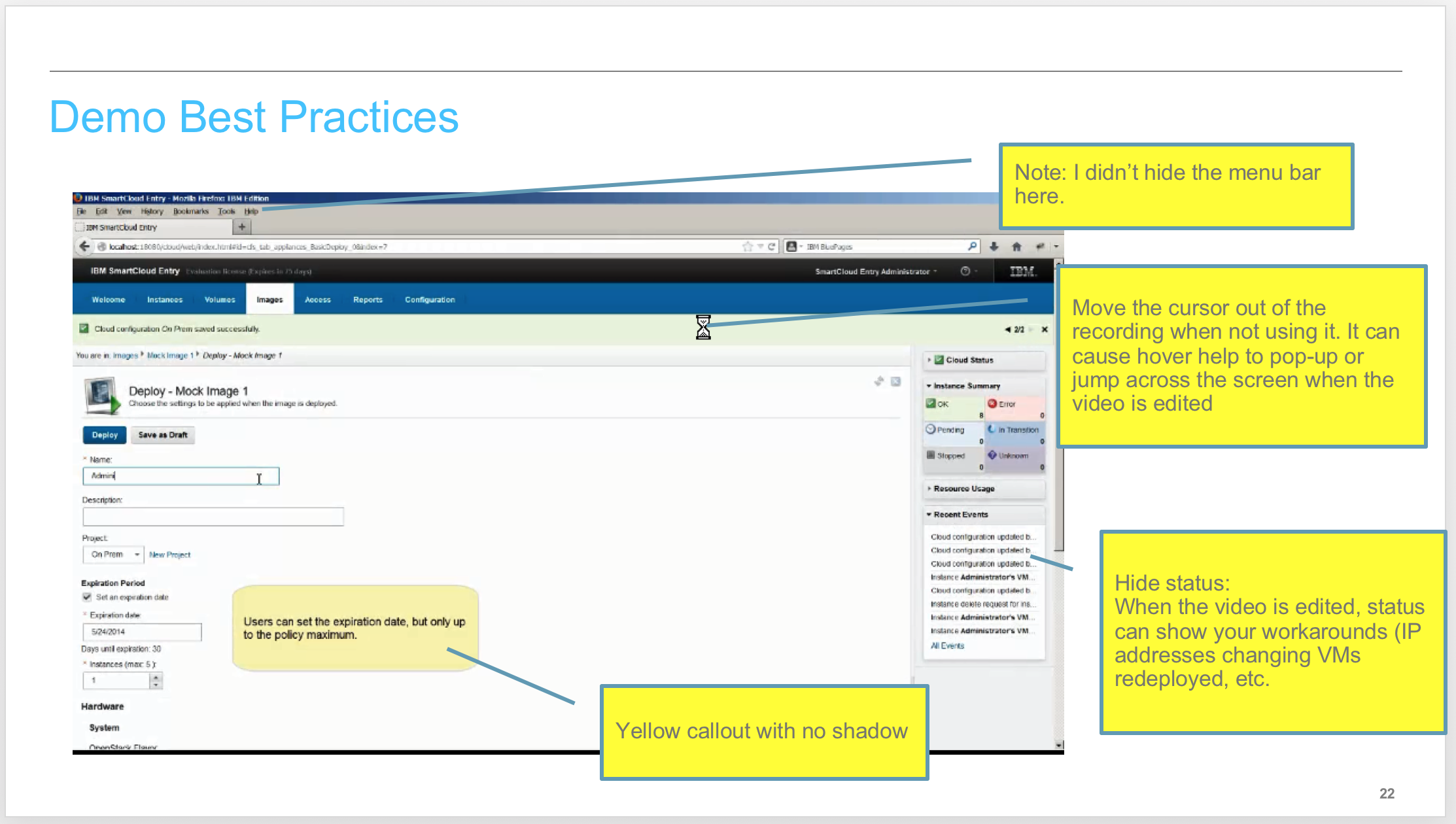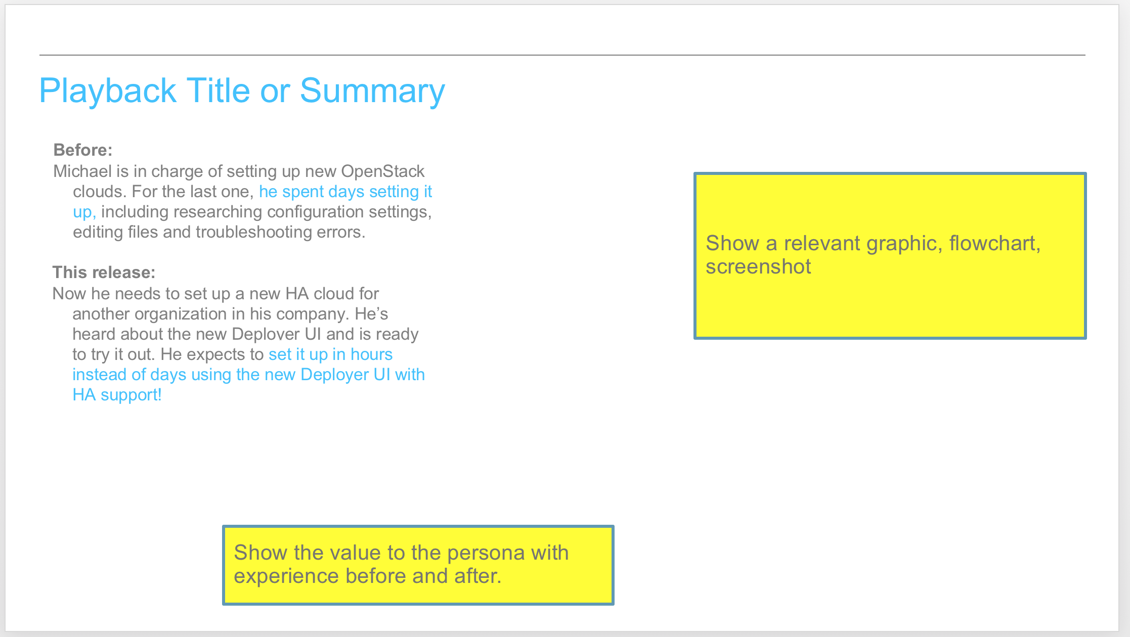 Telling the user’s story is a powerful way of communicating product impact. For the IBM Cloud Manager with OpenStack 4.3 release, I coordinated the crowdsourced production of assets that would be used for customer feedback and education. For each sprint and for the product release, development teams in the US and China made playback videos with some assistance from the design team. The playbacks were centered around personas, which helped to solidify team members’ understanding of the product in real world usage.