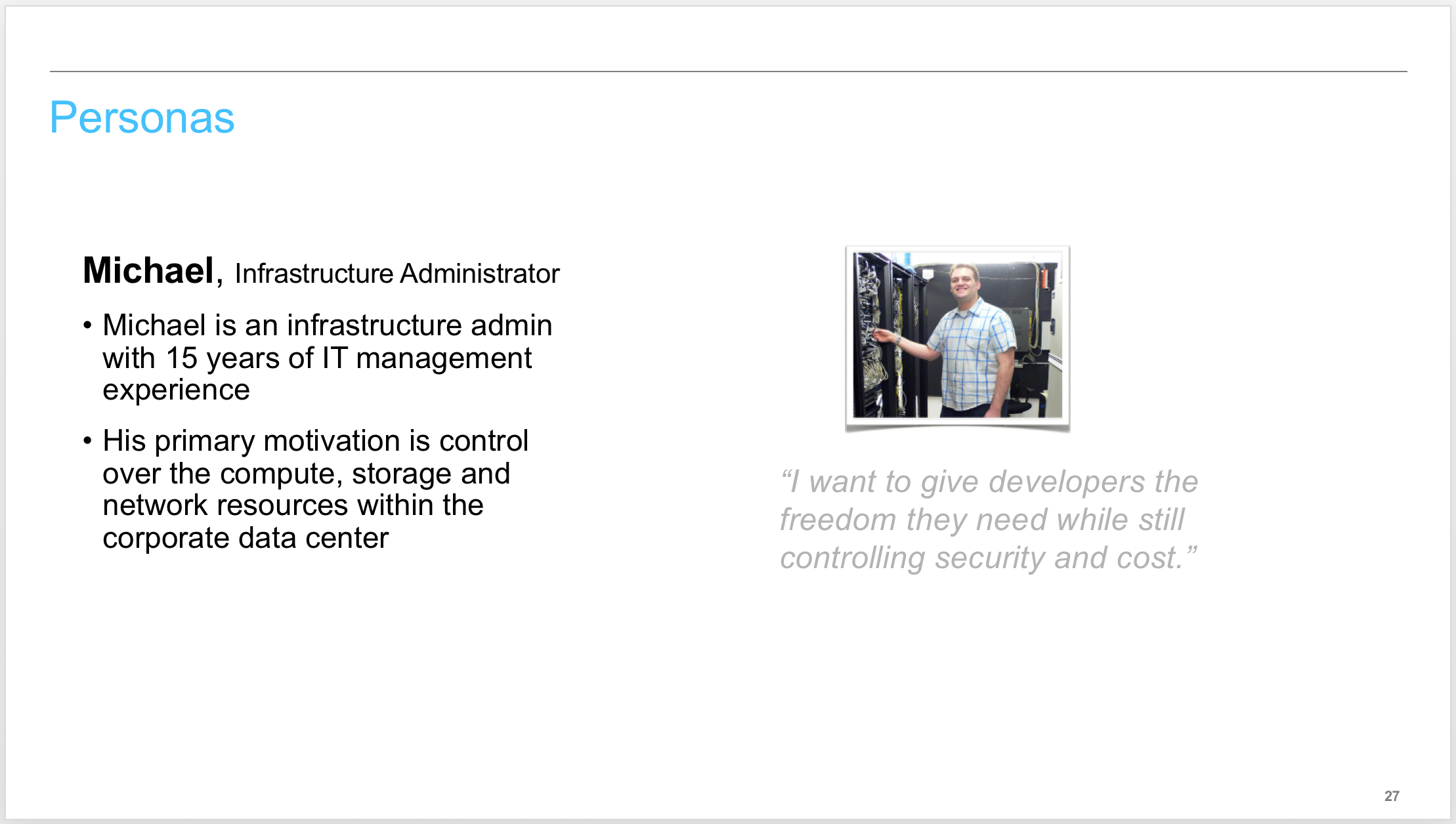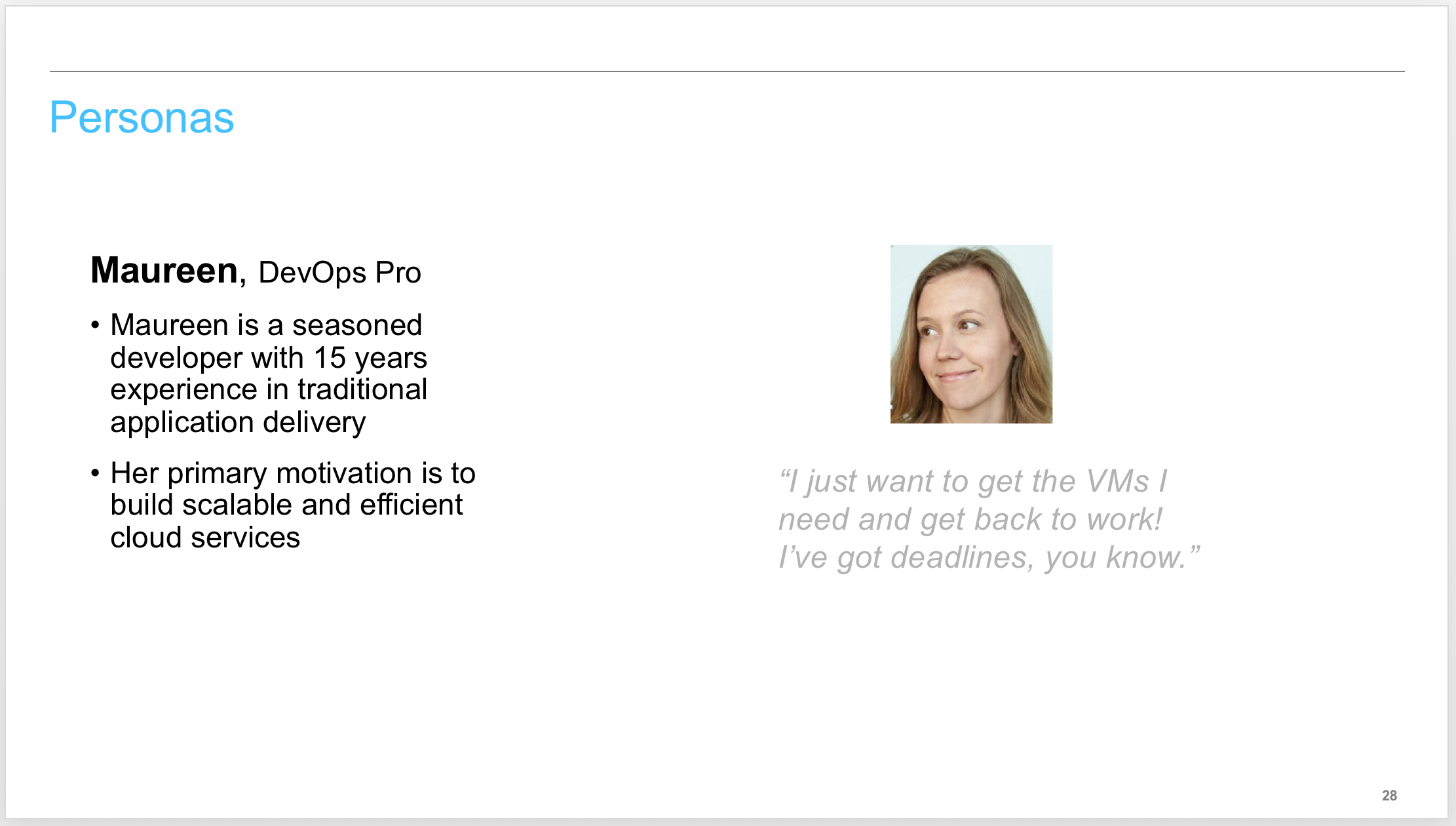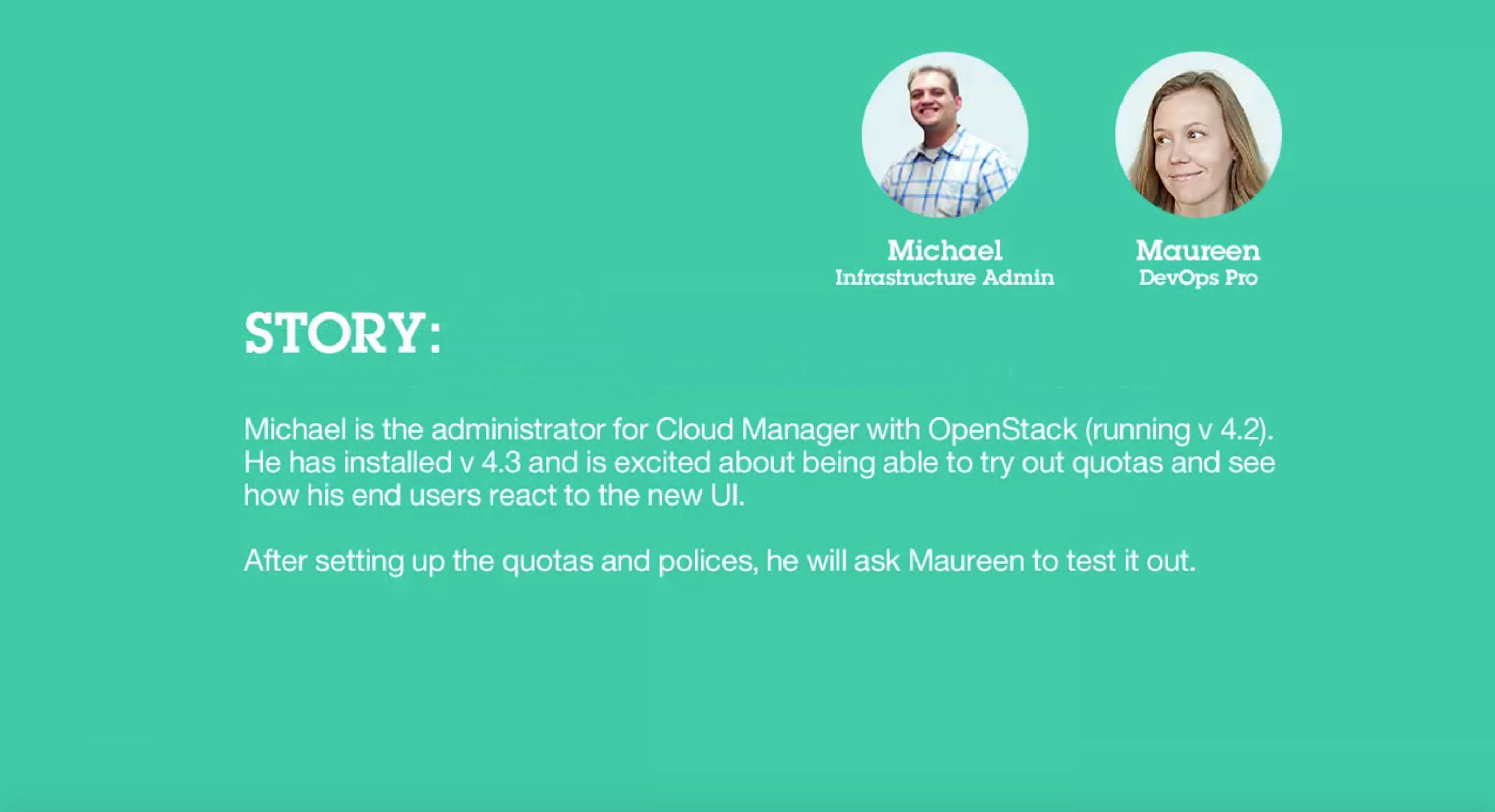 The playback videos told the story of the two personas, Michael (the cloud administrator) and Maureen (a developer). Each video starts by introducing the personas.